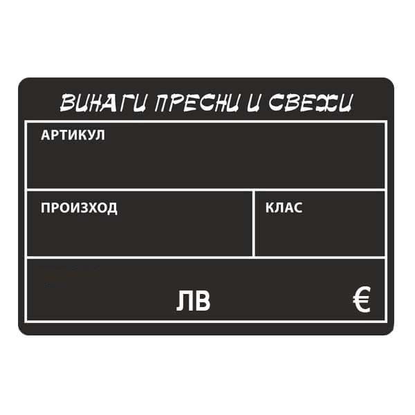 Черна табелка с размери 150 мм ширина и 100 мм височина е изработена от устойчив PVC материал, който гарантира дълготрайна употреба дори при интензивна работа в търговски обекти. Табелката е специално предназначена за маркиране на плодове и зеленчуци, като осигурява ясен и контрастен фон за всякакъв вид информация.