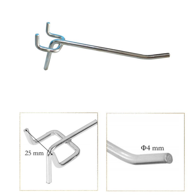 Кука за перфо гръб със захват 25 мм, изработена от здрава стоманена тел с диаметър 4 мм и дължина 150 мм. Предназначена за стабилно и надеждно закрепване към перфорирани панели в търговски обекти, складове и работни помещения. Идеална за окачване на различни продукти и аксесоари, като осигурява лесен достъп и подредба. Хромираното покритие предпазва от корозия и придава естетичен външен вид, като същевременно улеснява почистването. Монтажът е бърз и без необходимост от допълнителни инструменти.