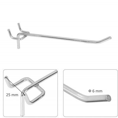 Кука за перфо гръб със захват 25 мм, изработена от здрава стоманена тел с диаметър 6 мм и дължина 300 мм. Подходяща за надеждно закрепване към перфорирани панели в магазини, складове и други търговски помещения. Осигурява стабилно окачване на различни видове продукти и аксесоари, като улеснява организацията и достъпа до стоките. Хромираното покритие предпазва от корозия, придава професионален вид и улеснява почистването. Монтажът е лесен и бърз, без нужда от допълнителни инструменти.