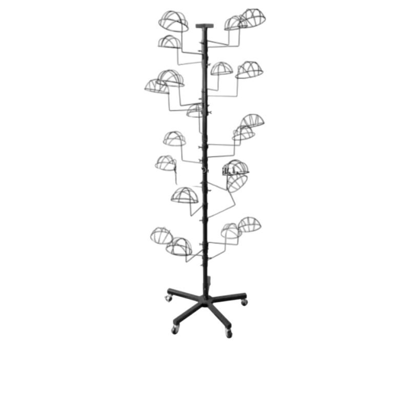 Металният щендер с височина 1900 мм и основа с диаметър 750 мм е проектиран за излагане на до 20 броя шапки. Конструкцията включва рингове или държачи, равномерно разпределени за лесен достъп и добра видимост на всяка шапка. Стабилната стойка осигурява сигурно позициониране, дори при пълно натоварване. Изработен от метал с устойчиво покритие, подходящ е за ежедневна употреба в търговска среда. Щендерът е отличен избор за магазини за аксесоари, търговски щандове и изложения, където пространството трябва да се използва ефективно.