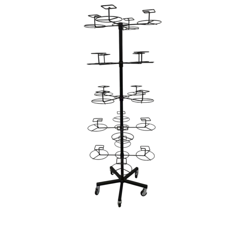 Щендерът за шапки с височина 175 см е компактен и функционален модел, предназначен за подредено и видимо излагане на до 20 броя шапки. Конструкцията е изработена от метал с прахово боядисано черно покритие, което осигурява устойчивост и естетичен вид. Държачите са равномерно разпределени, така че всяка шапка да бъде добре представена и лесно достъпна за клиентите. Щендерът е стабилен и подходящ за ежедневна употреба в магазини за облекло и аксесоари, изложбени площи и пазари. Благодарение на компактния си размер, заема минимално място, като същевременно предлага отличен капацитет.