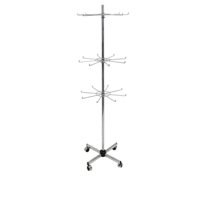 Щендер за аксесоари с три въртящи се етажа, изработен от устойчив хромиран метал. Конструкцията е стабилна и подходяща за интензивна търговска употреба. С компактна основа с диаметър 500 мм и височина от 1750 мм, този модел е идеален за представяне на голямо количество артикули в ограничено пространство.