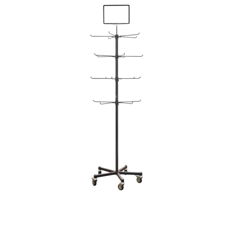 Четириетажен щендер за аксесоари, изработен от стабилна метална конструкция, боядисана в елегантен черен цвят. Основната височина на щендера е 1760 мм, като с допълнителната рекламна рамка достига обща височина от 2100 мм.