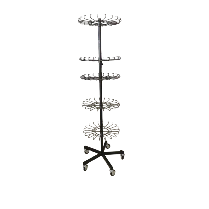 Изработен от здрав метал с прахово боядисано покритие в черен цвят, щендерът е устойчив на натоварване и честа употреба. Петте въртящи се нива позволяват лесен достъп до изложените продукти от всички страни и пълна видимост за клиентите.
