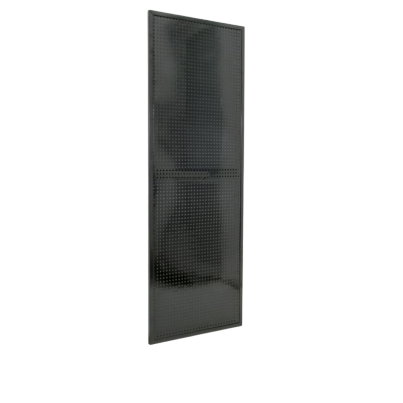 Перфорирано пано с метална рамка в класически черен цвят, предназначено за монтаж на стена. С размери 1000 × 2000 мм, паното предоставя обширна площ за излагане и организиране на различни стоки и аксесоари.
