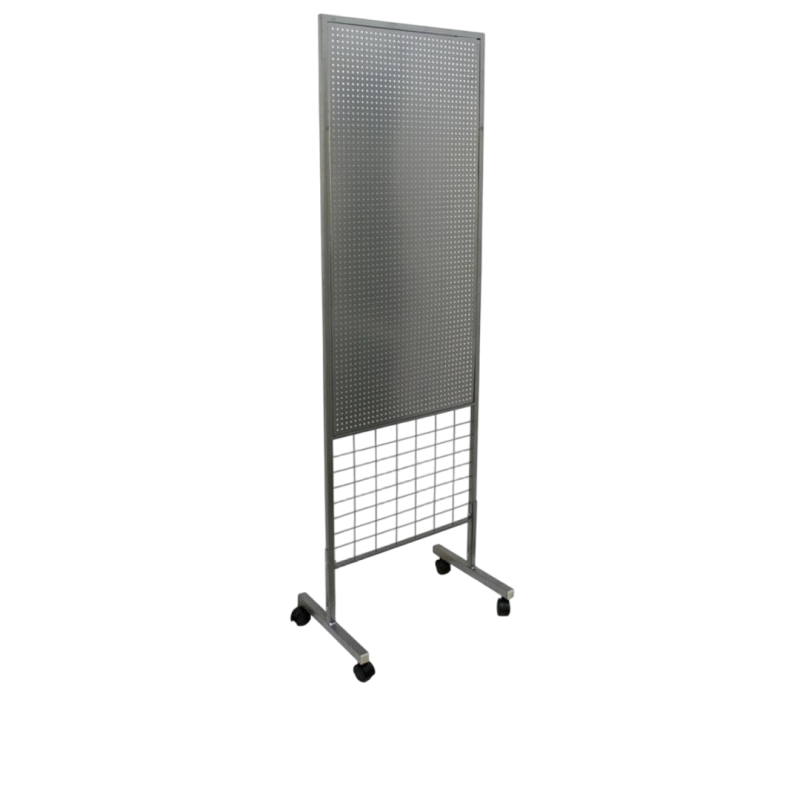 Мобилно перфорирано пано с решетка, оборудвано с Т-образни метални крака и колела, което позволява лесно преместване и гъвкаво позициониране в търговски и изложбени пространства. Размерът му е 600×1900 мм, което го прави достатъчно компактно за по-малки площи, но с добра видимост на изложените продукти.