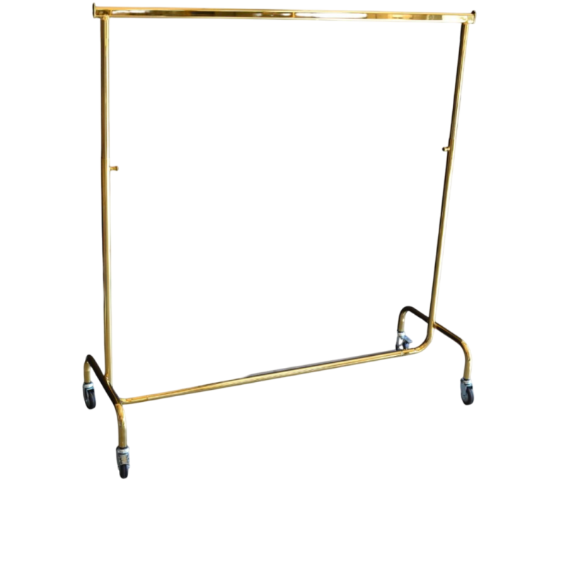 Изработен от здрав метал със стилно златно покритие, щендерът придава луксозно излъчване и е подходящ както за ежедневна търговска употреба, така и за бутици, модни събития и изложения. Регулируемата дължина позволява удобно окачване на повече артикули, а регулируемата височина го прави подходящ за всякакъв тип облекло – от ризи и блузи до дълги рокли и палта.