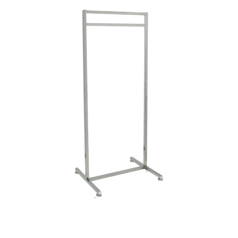 Щендер с хромирано покритие и стабилна основа с размери 60×50 см, предназначен за удобно и сигурно окачване на дрехи в магазини, гардероби или складови помещения. Височината от 140 см го прави подходящ за по-къси и средно дълги облекла като ризи, тениски и якета.