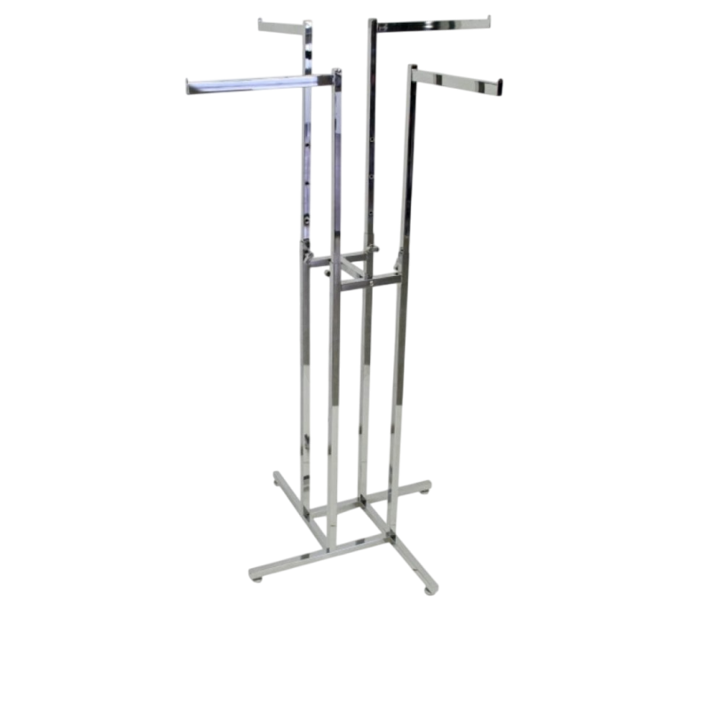 Четиристранен щендер с прави бастуни и регулируема височина, предназначен за ефективно излагане на дрехи от всички страни. С основа 800×800 мм и височина, която може да се регулира между 1350 и 1700 мм, този модел осигурява стабилност и голям капацитет за окачване.