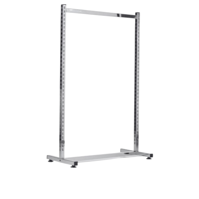 Щендер ПРО модел с хромирано покритие и стабилна конструкция с Т-крак, проектиран за търговски обекти, шоуруми и складове. С размери 1045×510 мм и височина 1655 мм, този модел осигурява удобна площ за окачване на дрехи и аксесоари.