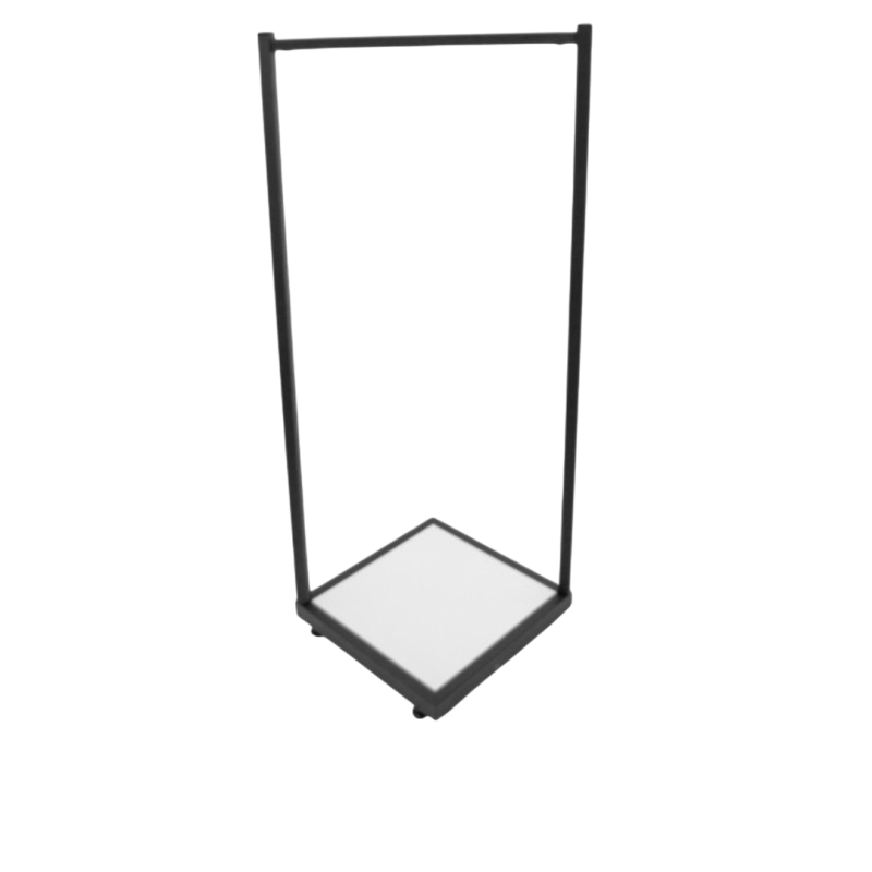 Щендер с черно матово метално покритие и основа от ПДЧ в бял гланц, предназначен за ефективно и стилно организиране на дрехи и аксесоари. Размерите на основата са 700×500×500 мм, а височината е 1430 мм, което го прави подходящ за по-къси и средно дълги облекла.