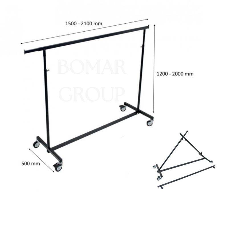 Сгъваем щендер с регулируеми размери и черно матово покритие, създаден за максимално удобство и гъвкавост в търговски обекти, шоуруми и складове. Дължината може да се настройва от 1500 до 2100 мм, с дълбочина 500 мм и регулируема височина в диапазона от 1200 до 2000 мм.