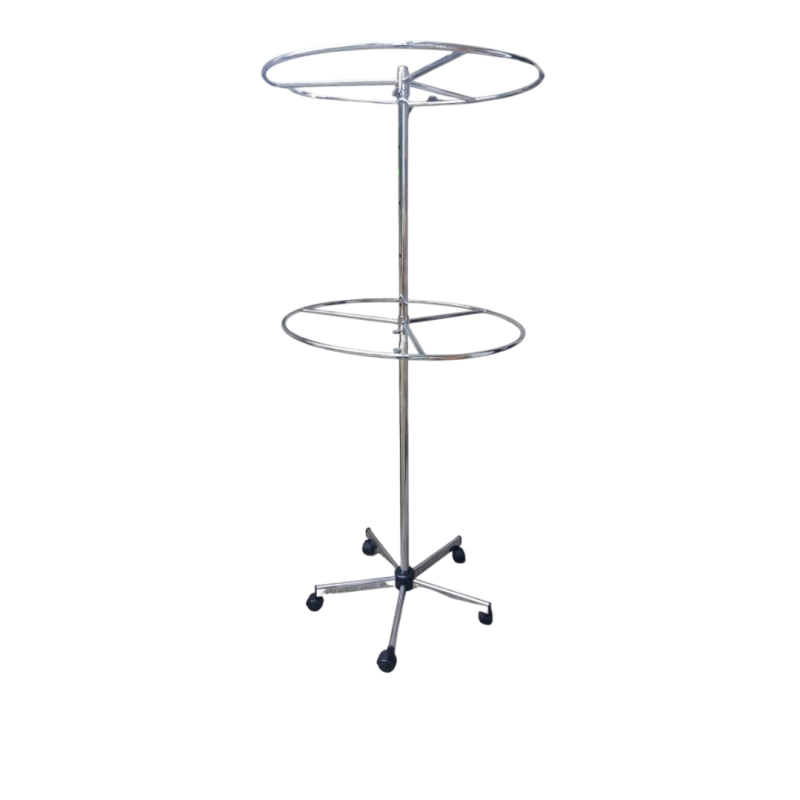 Щендер с два кръга и диаметър Ф76 мм, изработен от здрава метална конструкция с хромирано покритие. Този модел е предназначен за търговски обекти, шоуруми и складове, където се изисква здрав и стилен щендер за окачване на дрехи и аксесоари.