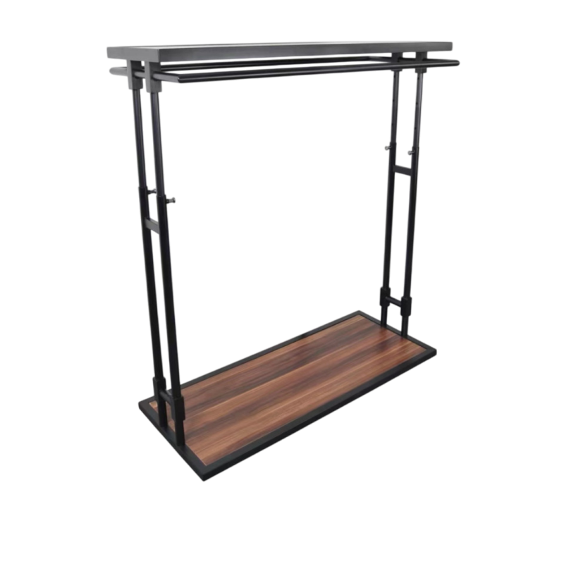 Щендер с черно матово покритие и регулируема височина, предназначен за търговски обекти, шоуруми и складове. Размерите са 1200 мм ширина и 500 мм дълбочина, а височината може да се настройва от 1000 до 1500 мм, което го прави подходящ за различни видове облекло и аксесоари.