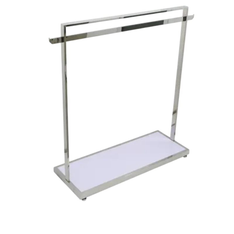 Щендер с бял МДФ и бастуни, предназначен за излагане на дрехи и аксесоари в търговски обекти, шоуруми или изложения. Размерите на конструкцията са 1200 мм ширина, 450 мм дълбочина и 1370 мм височина, с включени бастуни с дължина 1400 мм, които осигуряват допълнително пространство за окачване.