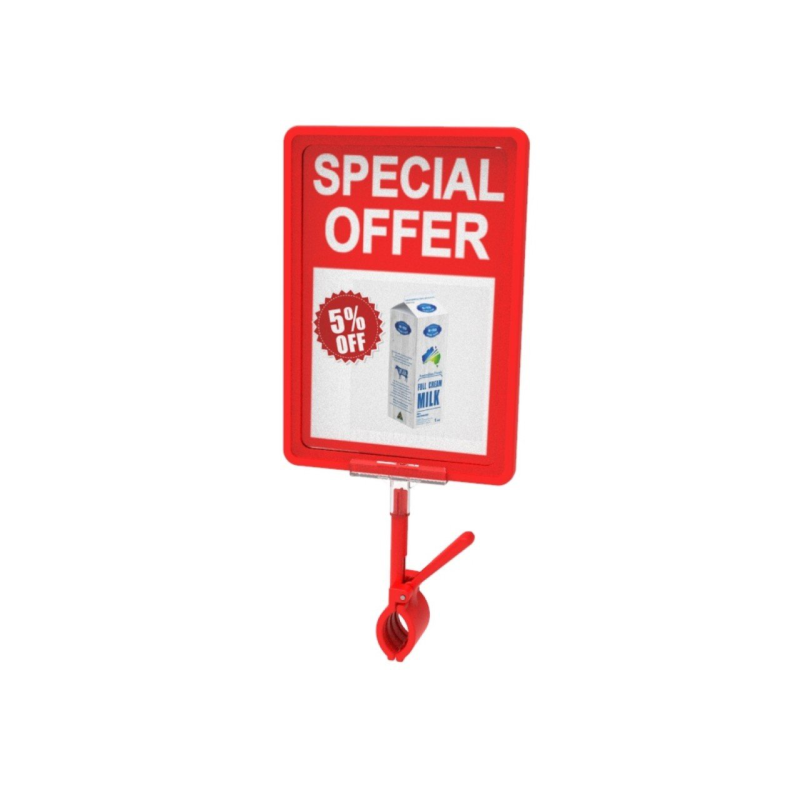 Комплектът включва здрава червена щипка и рамка с формат А4 (297 x 210 мм) в червен цвят, снабдена с прозрачен джоб. Щипката осигурява стабилно закрепване на рамката към различни повърхности, а прозрачният джоб предпазва документите от прах, замърсяване и надраскване, като същевременно гарантира отлична видимост. Подходящ за магазини, офиси, изложбени зали и други пространства, където е необходимо ясно и привлекателно представяне на информация. Изработен от устойчиви материали за дълготрайна употреба и лесна смяна на съдържанието.