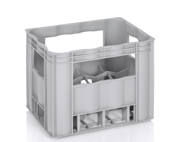 Пластмасова каса с 12 гнезда, предназначена за пренос на бутилки до 1 литър. Външните ѝ размери са 400 × 300 × 340 мм, а вътрешният размер на едно гнездо е 95 × 95 мм, което позволява удобно подреждане на бутилките и защита при транспортиране.
