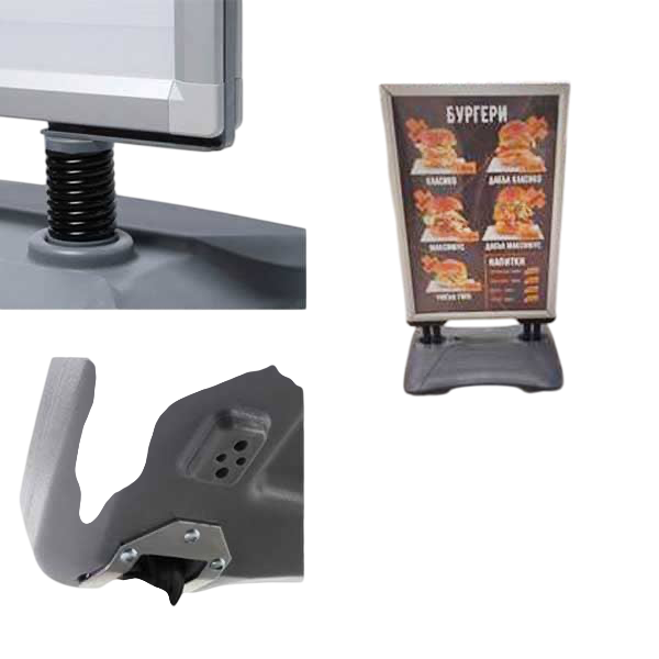 Статив за постери с устойчива пластмасова конструкция, подходящ както за външна, така и за вътрешна употреба. Побира постери с размер А1 (594 x 841 мм) и е двустранен, което осигурява видимост от двете страни. Оборудван е с колелца за удобно придвижване и позициониране. Практично решение за рекламни съобщения, менюта, промоции и други визуални материали.