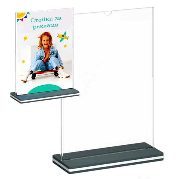 Вертикална стойка за меню, предназначена за листове формат А4 (297 x 210 мм). Изработена е от прозрачен плексиглас, който осигурява отлична видимост на съдържанието и лесна поддръжка. Стабилната и елегантна пластмасова основа гарантира устойчивост върху маси, плотове или рецепции. Благодарение на удобния дизайн смяната на листа става бързо и лесно. Подходяща е за менюта, ценови листи, промоционални оферти и информационни материали.