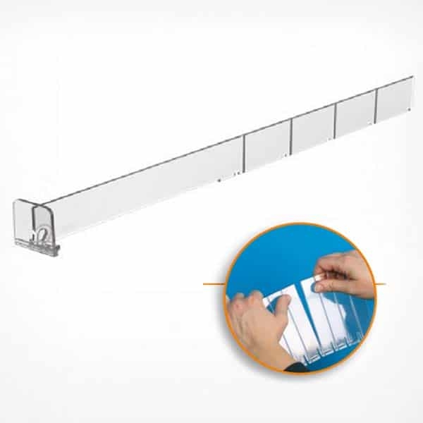 Разделител за рафтове с височина 30 mm и регулируема дължина 280–380 mm чрез отчупващи се сегменти. Предният стопер предотвратява изместване и падане на продуктите, а прозрачният поликарбонат осигурява добра видимост и висока удароустойчивост. Подходящ за подреждане и ясно отделяне на ниски артикули в търговски обекти, складове и хладилни регали.