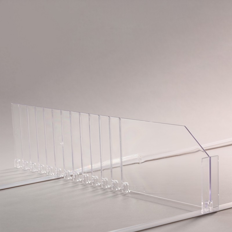 Разделител за рафтове с височина 120 mm и регулируема дължина от 280 до 480 mm чрез 8 отчупващи се елемента през 25 mm. Вграденият преден стопер с височина 75 mm задържа продуктите и предотвратява приплъзване при зареждане и вземане. Прозрачният поликарбонат осигурява висока удароустойчивост и добра видимост на стоката. Подходящ за организиране на редове, отделяне на артикули и оптимално използване на рафтово пространство в магазини, складове и хладилни регали.
