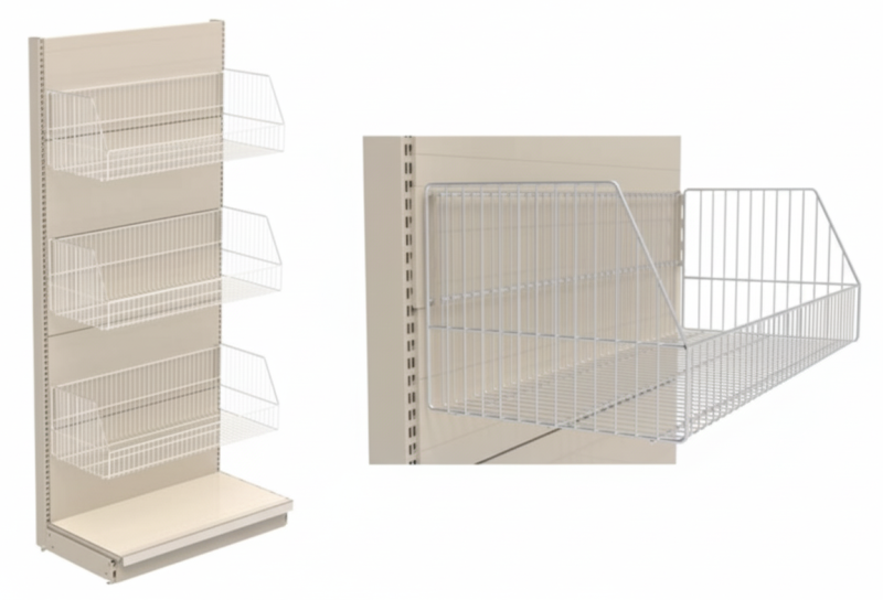 Идеална видимост и достъпност - дизайнът на кошовете улеснява клиентите да виждат цялата гама от продукти и да ги достигат без усилие. Това стимулира продажбите и подобрява клиентското преживяване.