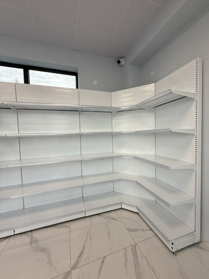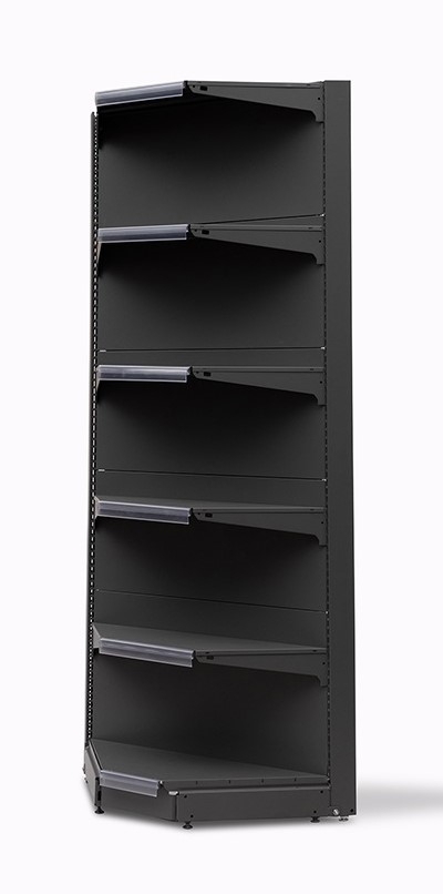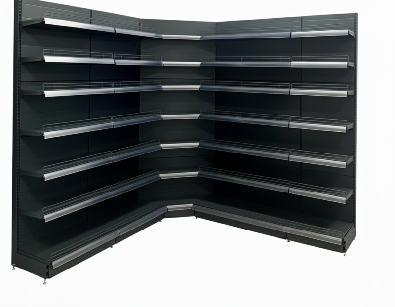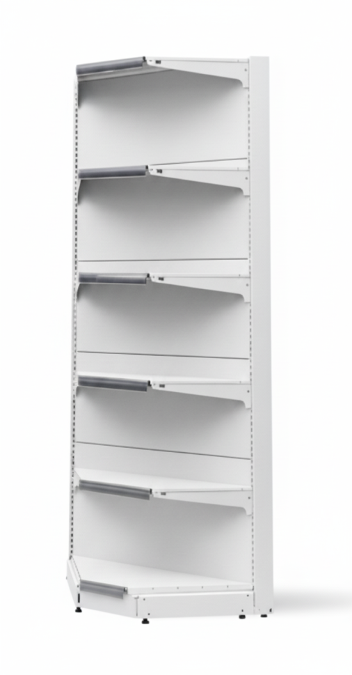 Максимално Усвояване на Пространството: Този ъглов модул позволява да изградите непрекъснат стелажен ред, който се движи по периметъра на магазина, оптимизирайки всеки квадратен метър от Вашата търговска площ.