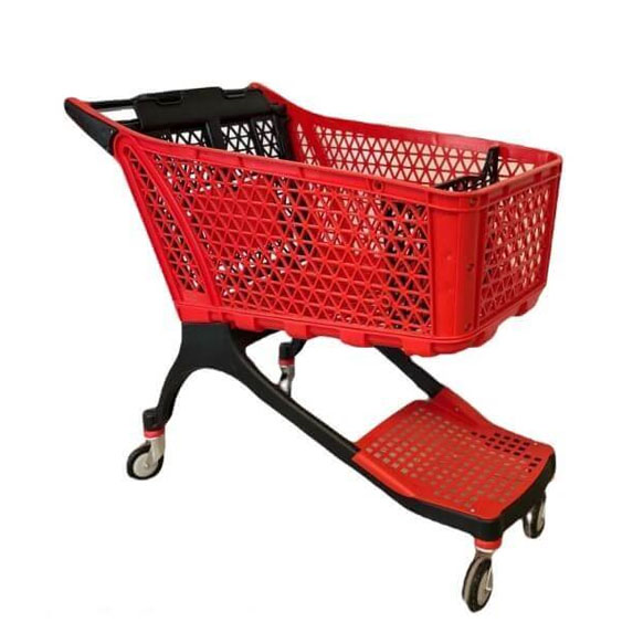 Тази количка представлява премиум решение за всеки съвременен търговски обект, търсещ комбинация от издръжливост, лекота и многофункционалност. Атрактивният червен цвят на коша привлича вниманието и добавя визуален акцент, докато капацитетът от 150 литра е идеален за средно до голямо пазаруване. Ключовият иновативен материал е кошът, изработен от 30% полипропилен, подсилен със стъклени влакна. Това осигурява отлична устойчивост на удар и по-тихо движение. Количката е проектирана с мисъл за максимално клиентско удобство: включва вградена детска седалка за сигурност, разделител за продукти за по-добра организация на стоките и багажна стойка (долна платформа), която увеличава ефективния капацитет за обемисти покупки. С удобна дръжка и четири стабилни колела, количката е изключително лесна за управление. Нейните оптимизирани размери (дължина 101 см, ширина 59 см, височина 99,5 см) я правят подходяща както за големи, така и за по-тесни търговски площи. Инвестирайте в тази високофункционална количка, за да предложите на клиентите си комфортно, организирано и модерно пазаруване.