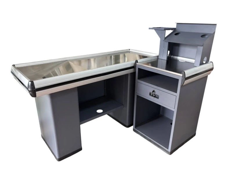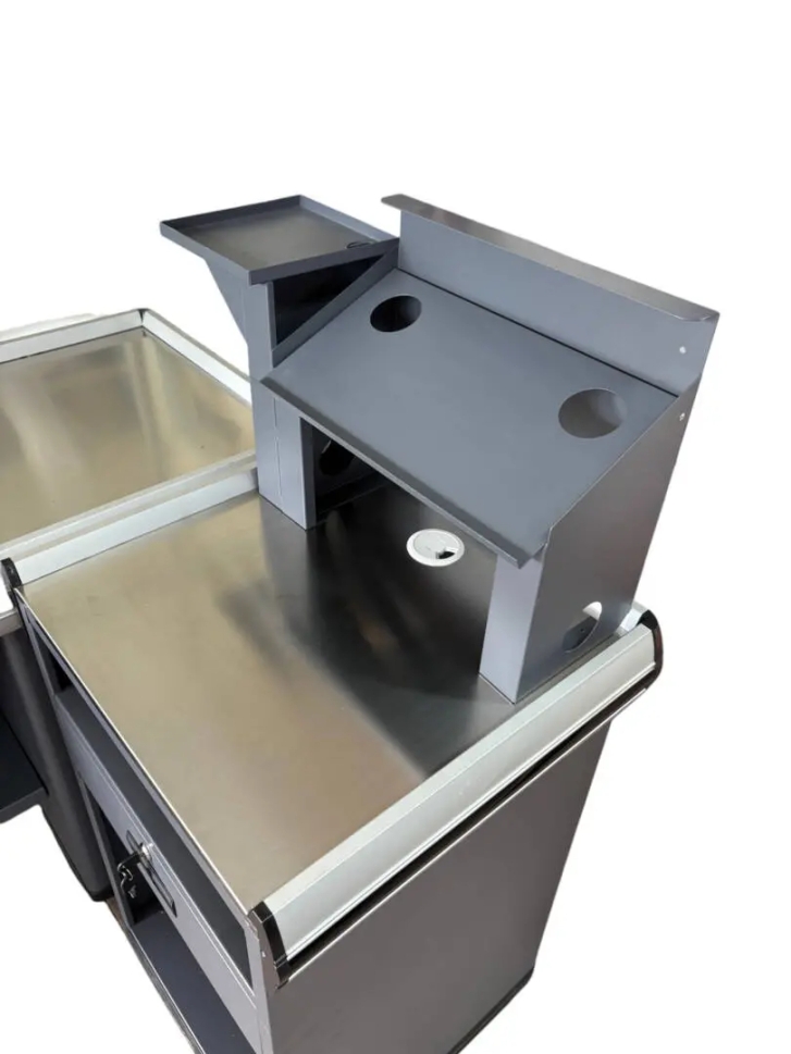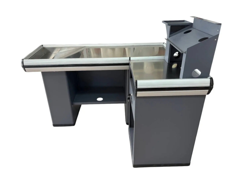 Професионално решение за организация на касовата зона, проектирано да осигури максимална ефективност при обслужване на клиенти и ергономичност за касиера. Този Г- образен модул съчетава модерен дизайн в тъмно сив мат с изключителна здравина, подходящ за супермаркети и специализирани търговски обекти.